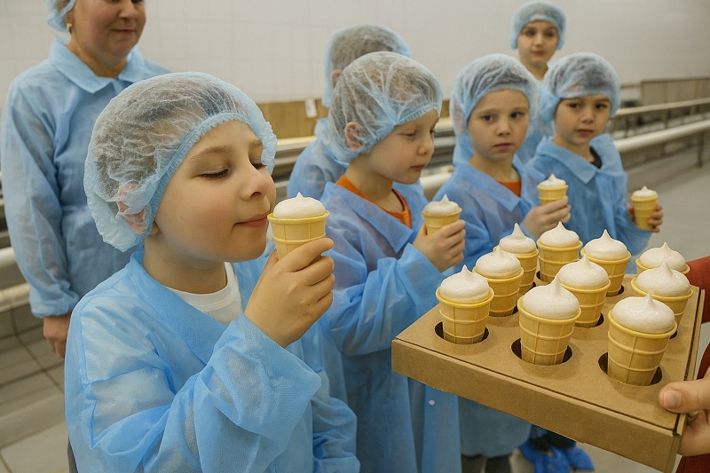Важная часть маршрута — дегустация свежего мороженого прямо с конвейера. Дети и взрослые с удовольствием пробуют несколько видов продукции, узнают о вкусовых отличиях и получают ответы на интересующие вопросы.