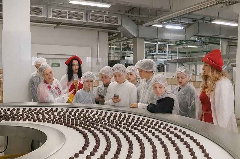 На экскурсии по фабрике вам выдадут специальные белые халаты и шапочки, как у сотрудников. Вы не только изучите отдельные производственные процессы — от подготовки сырья до упаковки готовой продукции, но и сможете продегустировать конфеты, только-только сошедшие с конвейера, свежайшие, покрытые ещё не остывшим шоколадом.